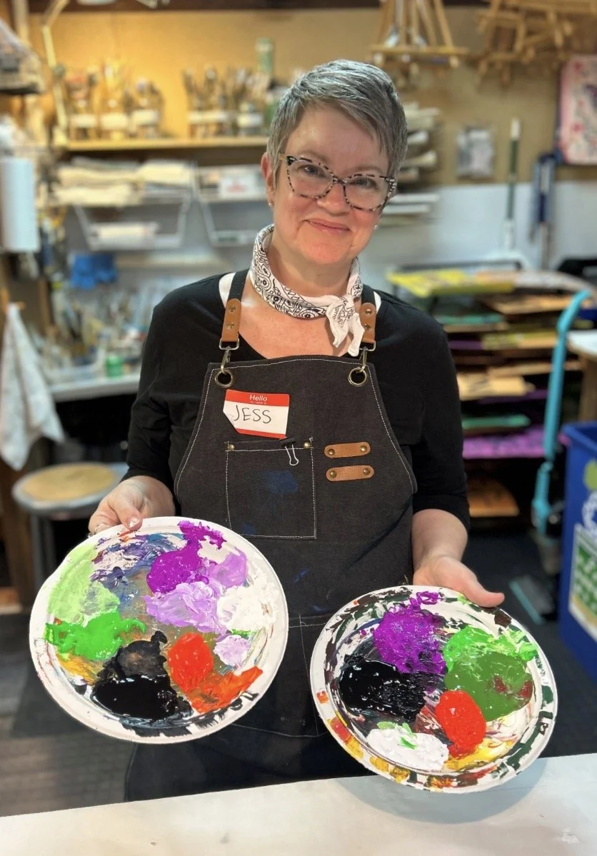 The Grown Folks Art Club is hosted by art instructor Jess Dewes. She has more than 10 years' experience teaching studio art in public K-12 schools in both Missouri and Vermont. A proud graduate of McCluer High School, The Kansas City Art Institute, and Webster University, Jess's love of art is centered on her appreciation for the small details in everyday objects. She proudly embraces her lack of sophistication when drawing and painting, asking her students to prioritize the process over the product. Her mantra is, "It doesn't matter if it looks real, as long as it FEELS real." Jess lives in Rock Hill with her husband, Mike, and dog, Ruth. She is a new "empty nester", figuring out how to navigate a new chapter of life with her one and only child away at college for the first time.